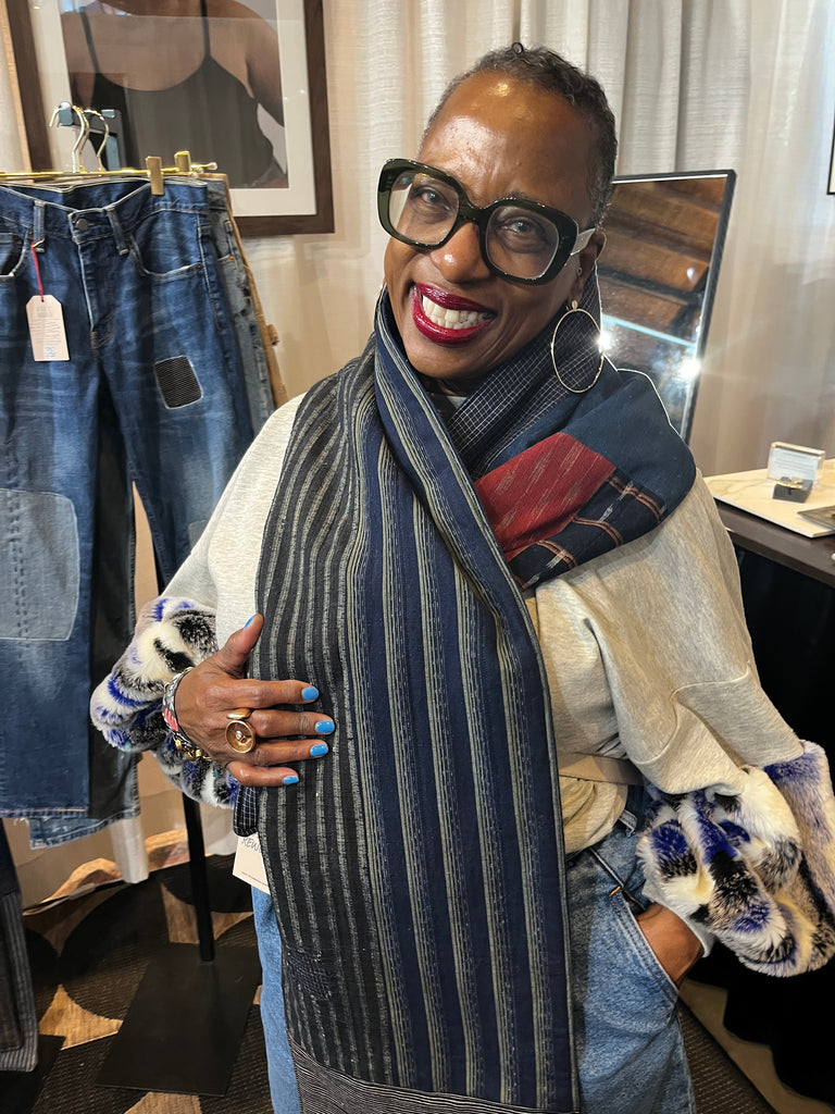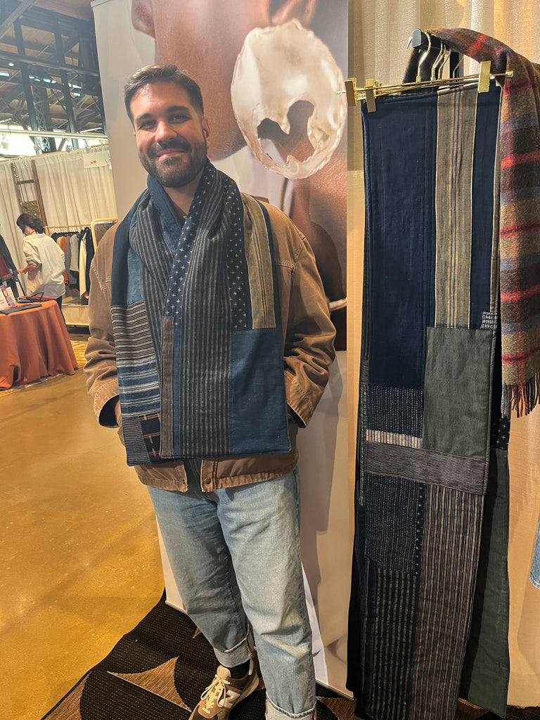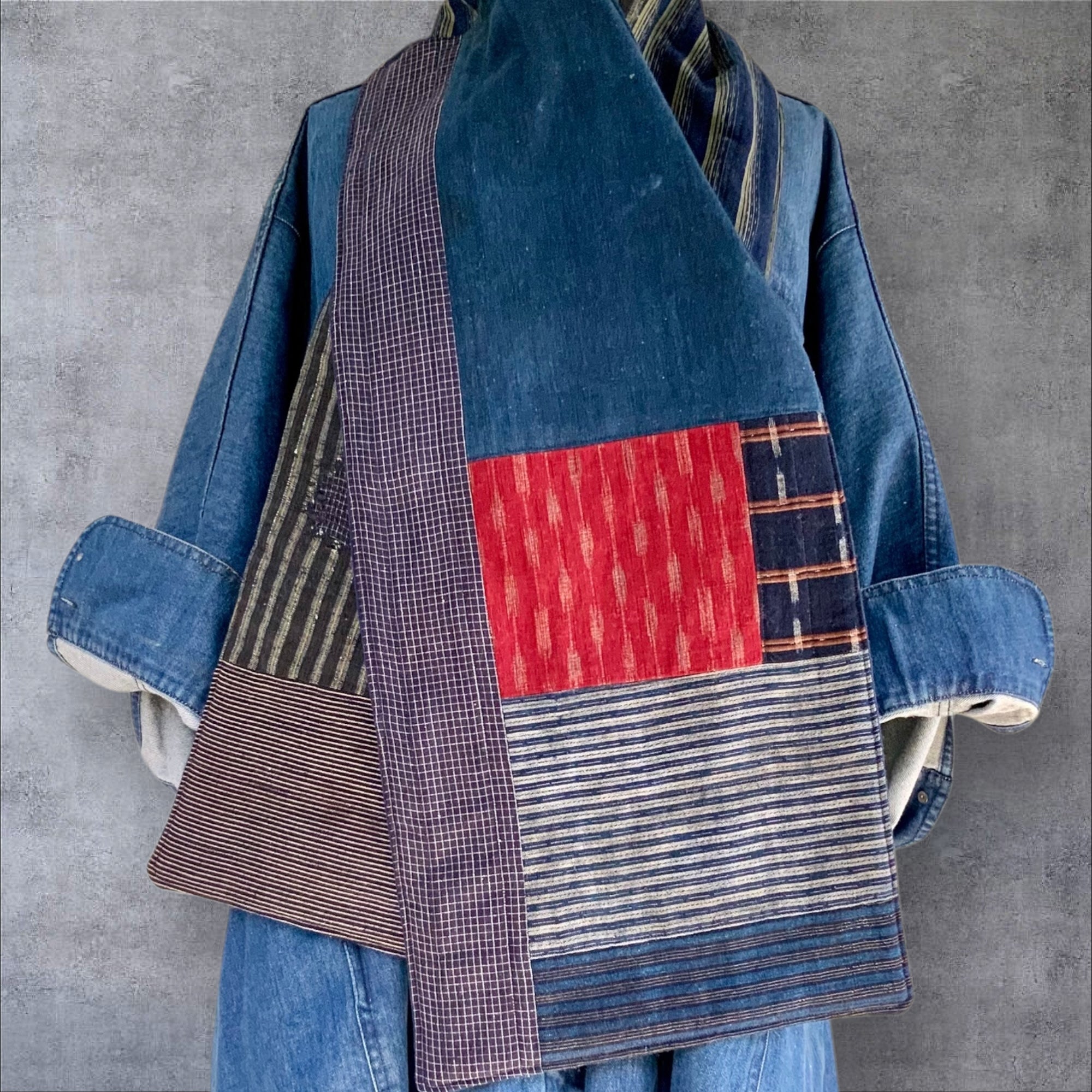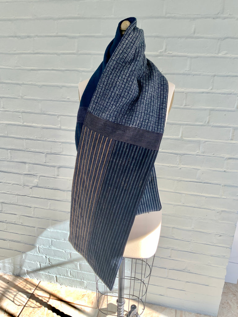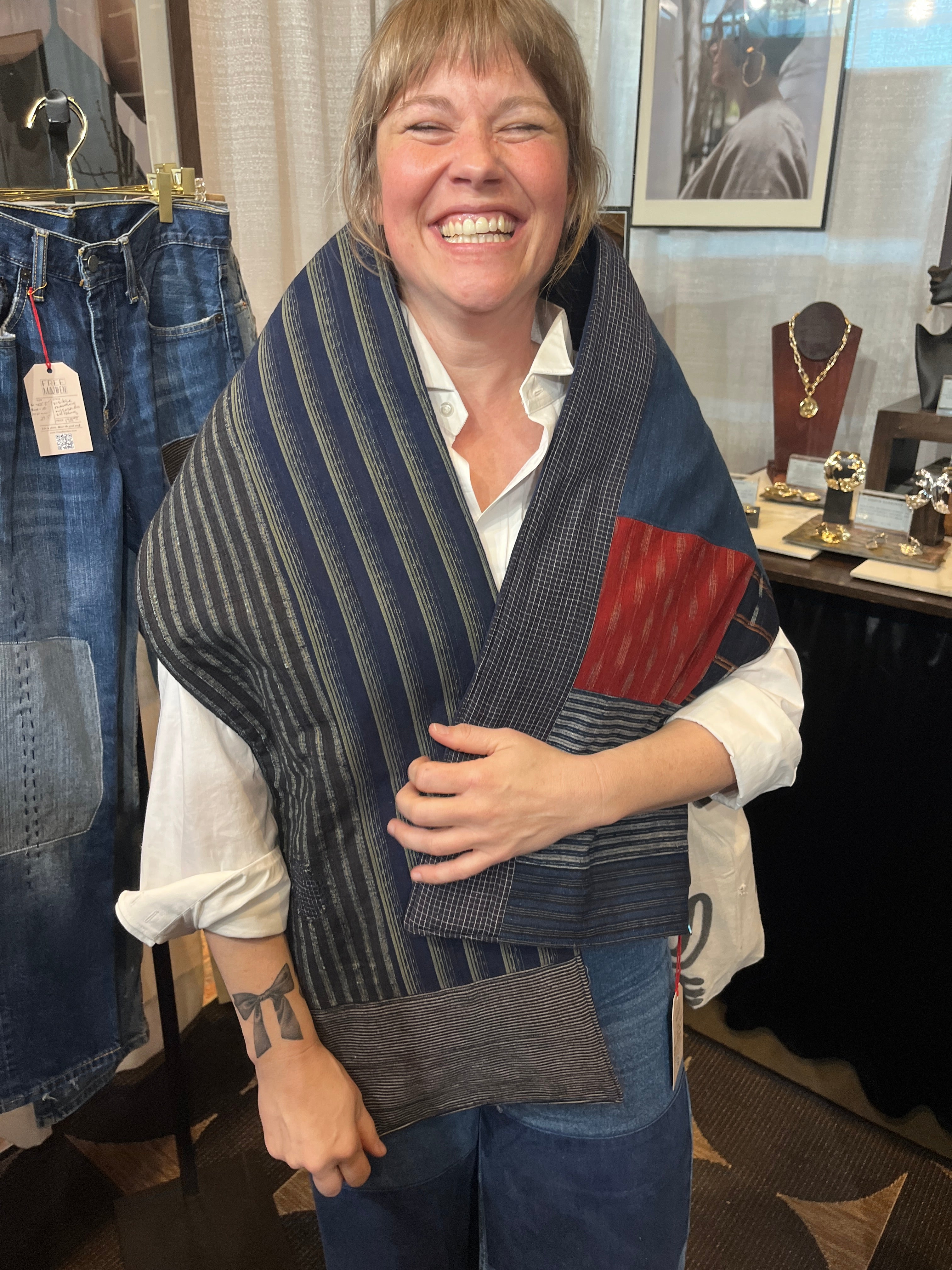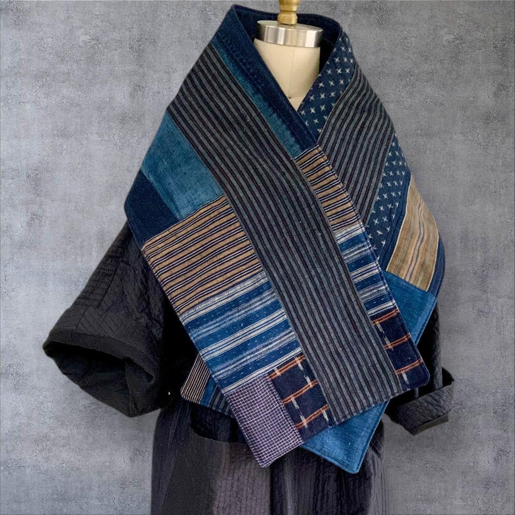 SABI, a Japanese word referring to the beauty that comes with age. It points to the loveliness that life and time leave on an object. This scarf was made from vintage Japanese Boro and Aizome textiles. They are insulated, as well as reinforced with a complementary cotton fleece backing. They’re meticulously and intentionally sewn together to tell their own unique stories. Each scarf is different and my hope is that you find the one that connects with your own story.